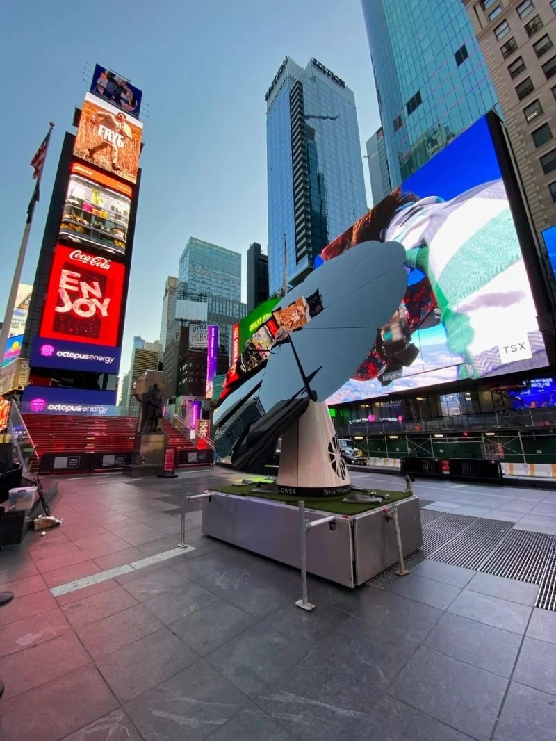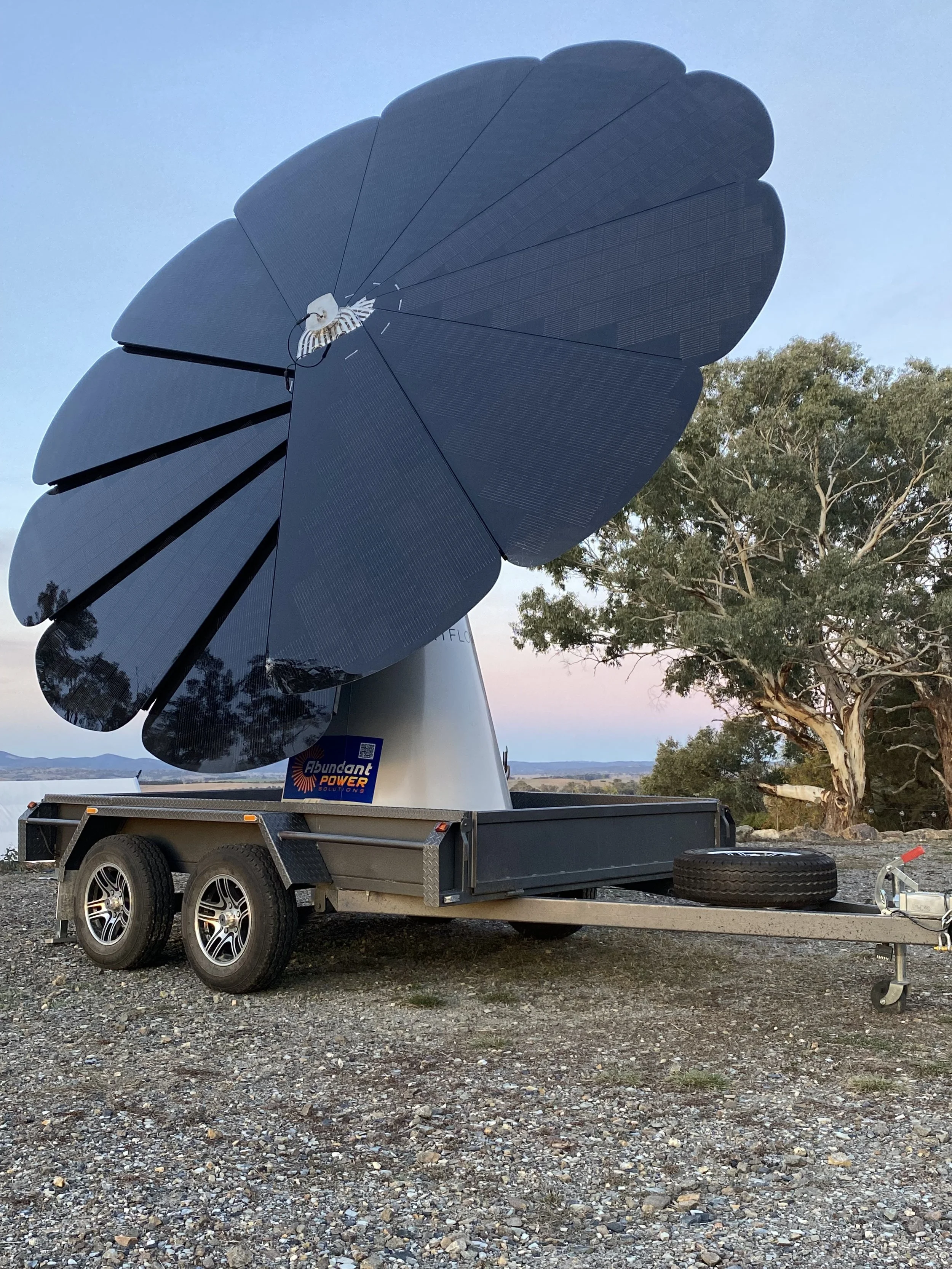 Solarflower solar panels, mounted on a trailer with two wheels, parked on gravel with trees and sky in the background.
