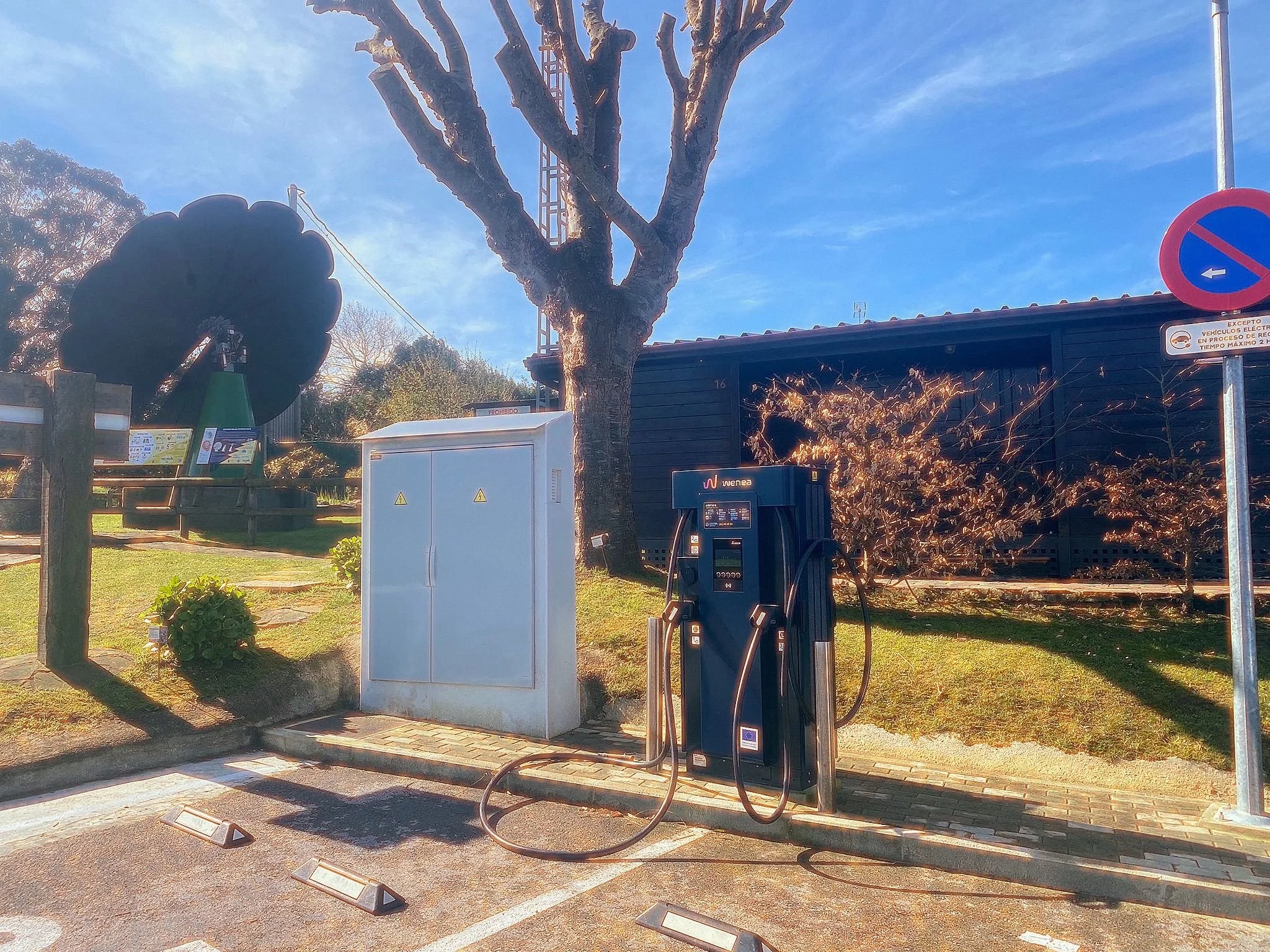 Electric vehicle charging station with a solarflower, parking space, a tree, and a building in the background under blue sky.