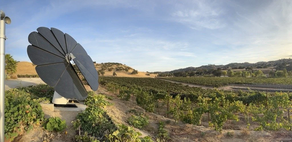 Solar panel in vineyard landscape with rolling hills and blue sky.